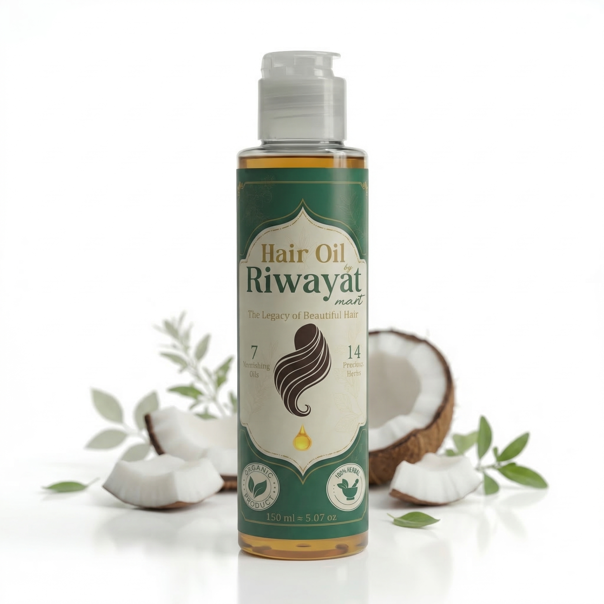 Riwayat Organic Hair Oil Plus is a herbal formulation designed to provide deep nourishment using a coconut oil base infused with 14+ natural herbs and several beneficial oils. Coconut oil is widely known for its ability to penetrate the hair shaft and reduce protein loss, helping keep hair strong and healthy.